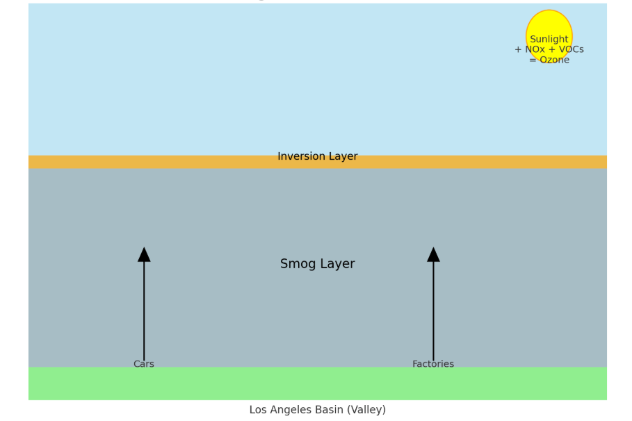 정리해보면, 산업시설과 자동차에서 배출된 질소산화물(NOx)과 휘발성유기화합물(VOC)이 햇빛과 반응하여 오존을 형성했고, 분지 지형의 특성과 기온 역전층(지표면의 공기가 위보다 차가워져 오염이 위로 확산되지 못함)의 발생으로 스모그가 하늘에 갇혀 스모그를 발생시킨 것이 LA스모그이다.